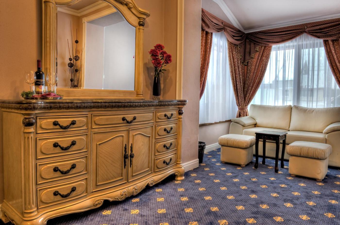 Deluxe Double Room. The double room provides a sofa, a carpeted floor, as well as a private bathroom boasting a shower and a hairdryer. The spacious double room features a minibar, a tea and coffee maker, a wardrobe, a flat-screen TV with satellite channels, as well as mountain views. The unit has 2 beds. ;
